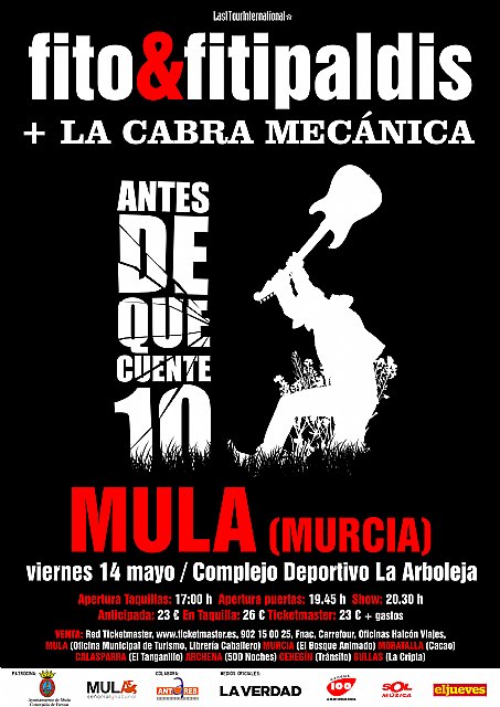 Fito y los Fitipaldis ofrece en Mula su primer concierto en la Región de su gira Antes de que Cuente 10 en un espectáculo que tendrá lugar el próximo 14 de mayo en el Complejo Deportivo La Arboleja de la localidad. Actuará como telonero el grupo La Cabra Mecánica.