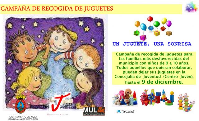 08.07.11 La Concejalía de Servicios Sociales con la colaboración de la Concejalía de Juventud y La Caixa han puesto en marcha una Campaña de Recogida de Juguetes que, bajo el lema "Un juguete, una sonrisa" pretende recoger juguetes para las familias más desfavorecidas del municipio con niños de 0 a 10 años.
