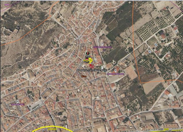 Servicios de emergencia acuden a un derrumbe de parte de una cornisa de un edificio en la calle Barrancal en el término municipal de Mula.