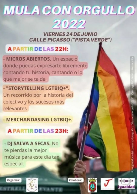 Así, para ese día, los jóvenes muleños con la colaboración del Ayuntamiento de Mula han organizado una propuesta de Micros Abiertos donde cualquier persona pueda expresarle libremente contando su historia, cantando o lo que desee mostrar a los asistentes. También tendrá lugar un ‘Storytelling LGTBI+’, un recorrido por la historia del colectivo y los sucesos más relevantes. En el mismo espacio habrá merchandising LGTBI+. A partir de las 23.00 horas habrá música en directo con DJ Salva a Secas.