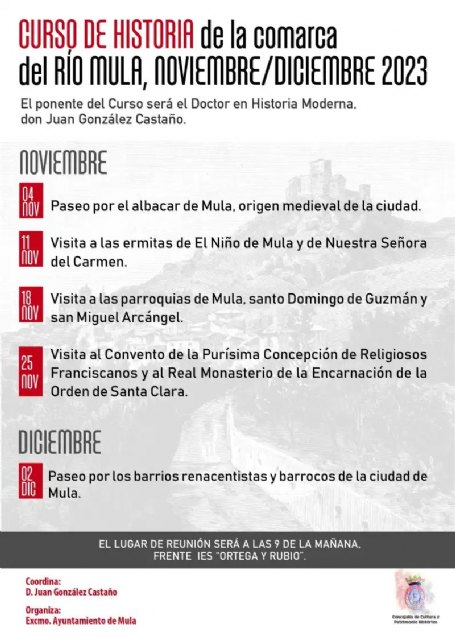 La Concejalía de Cultura del Excmo. El Ayuntamiento de Mula organiza un Curso de Historia de la Comarca del Río Mula que se desarrollará durante los meses de noviembre y diciembre del presente año.
