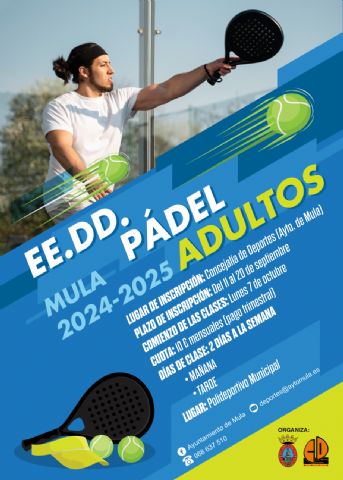 Para los adultos, se ha organizado una Escuela Deportiva de Pádel, cuyas clases se impartirán dos días a la semana, con horarios de mañana y tarde. Las inscripciones se pueden realizar en la concejalía de Deportes del 11 al 20 de septiembre, y la cuota mensual es de 10€ (pago trimestral). Las clases comenzarán el 7 de octubre en el Polideportivo Municipal.