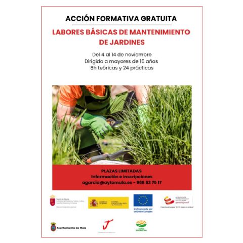 La concejalía de Juventud del Ayuntamiento de Mula ha anunciado la apertura de inscripciones para el curso “Labores Básicas de Mantenimiento de Jardines”, dirigido a personas mayores de 16 años. Esta formación, que se llevará a cabo del 4 al 14 de noviembre, tiene como objetivo capacitar a los participantes en técnicas y conocimientos esenciales para el cuidado y mantenimiento de jardines, abriendo nuevas oportunidades en el ámbito laboral.
