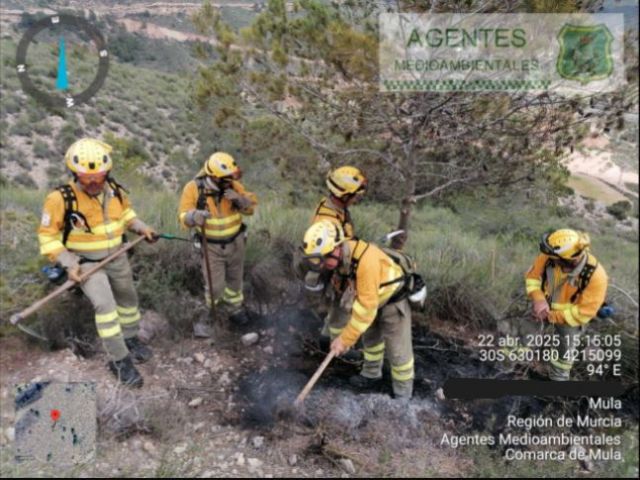 Hoy, a las 14:05 h, el Centro de Coordinación de Emergencias 1-1-2 recibió una alerta por un incendio forestal en las inmediaciones del viaducto de Bullas ( *Mula* ), provocado por la caída de un rayo . Al lugar se desplazó una *Brigada Forestal* junto a *Agentes Medioambientales* , quienes informaron a las 15:28 horas sobre la extinción de un *conato* de incendio que afectó aproximadamente a 8 m² de matorral y un pino.