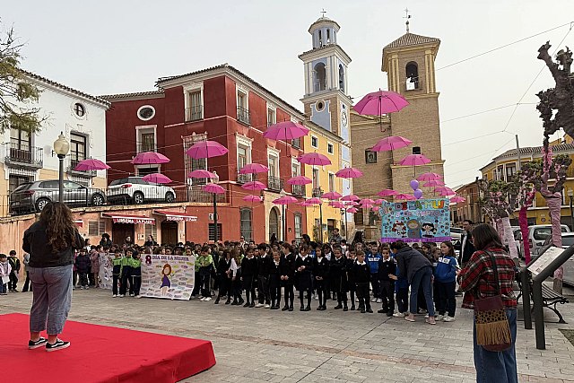 La Plaza del Ayuntamiento ha acogido hoy la presentación de lecturas y pancartas relacionadas con el 8M, realizada por el alumnado de 2º de Primaria de los centros educativos de Mula, en una actividad que ha convertido una de las zonas más emblemáticas del municipio en un punto de encuentro educativo y de sensibilización en torno a la igualdad.