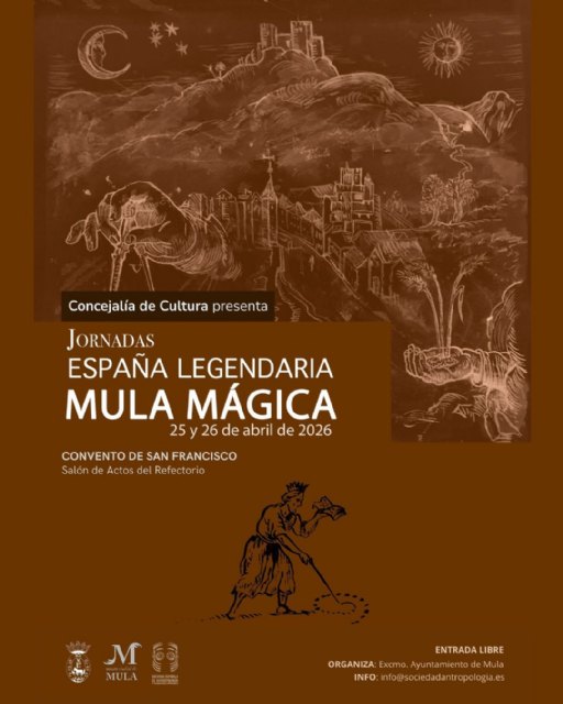 La concejalía de Cultura del Ayuntamiento de Mula anuncia la celebración de las Jornadas “España Legendaria: Mula Mágica”, que tendrán lugar los días 25 y 26 de abril de 2026 en el Convento de San Francisco, en el Salón de Actos del Refectorio, con entrada libre.